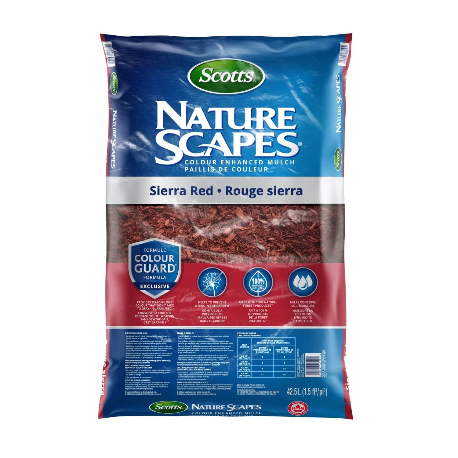 Season-long colour that won’t fade to gray? You got it. Scotts Nature Scapes Colour Enhanced Sierra Red Mulch with exclusive ColourGuard Formula helps keep your landscaping looking great. Works to prevent weeds and hold in moisture, too. Plus, it’s made with 100% natural forest products. There’s no recycled wood or contaminates in this mulch. Use around all types of plants, including trees, shrubs, flowers, or vegetables.