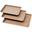 A recipe for successful baking and cooking begins with having the right tools on hand for the task! This non-stick, 3 piece cookie sheet set allows for baked goods and other food items cooking to slide off easily. The set comes with the popular sizes of 14", 16" and 18" which offer great versatility. Each cookie sheet comes with an integrated diamond pattern, allowing for better heat distribution and greater non-stick performance. Constructed of high quality carbon steel, which helps resist warping while also conducting heat in an efficient manner. Clean up is a simple task thanks to the durable Quantum 2 non-stick coating which is dishwasher safe.