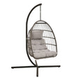 The omega egg chair draws inspiration from the latest in outdoor seating trends. New Design with low profile. Easier to get in and out of the chair. A sturdy black frame suspends an intricate woven rope chair lined with plush light-grey cushions for ultimate relaxation. This outdoor accent chair demands attention and will add a modern touch to any entertaining area. Pairs well with lush green foliage and the beverage of your choice.