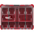The MILWAUKEE® PACKOUT™ Deep Organizer has a 50lb weight capacity and is constructed with impact-resistant polymers to withstand harsh job site conditions. The weather seal has an IP65 rating that protects tools, accessories, and parts from rain and other job site debris. The organizer's interior features quick-adjust dividers and a deep design for holding both large fittings and small parts. The transparent lid of the organizer seals the compartments to prevent contents from migrating and travelling during transport. The PACKOUT™ modular storage system allows for storage customization to easily transport and organize tools and accessories.