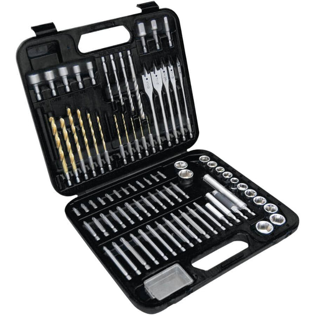 This Radley 84 Piece Drill Driver Bit set includes 1/4" quick change hex shanks for convenient, fast bit changes. Titanium-nitrate coating creates less friction and runs cooler, while extending blade life. Drill holes in wood, plastic, metal or concrete up to 3/4”. Full range of 1”, 2” and 3”screw driving bits for furniture assembly and other projects around the home. Includes metric and SAE Sockets up to 19mm and 3/4".