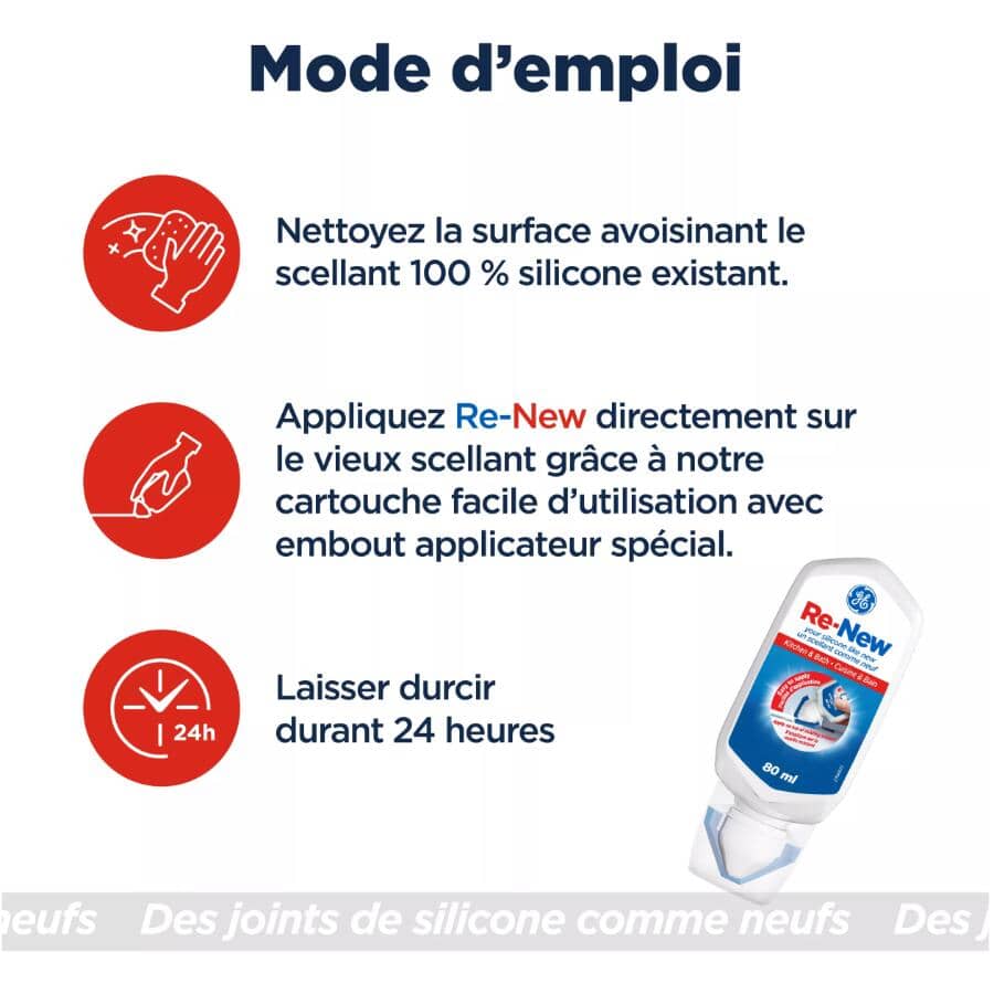 Damaged caulk in your kitchen area or bathroom can unfortunately have long-lasting impacts. Instead, try the right kind of long-lasting results that come with the quick and simple use of GE RE-NEW Sealant in no time at all! Renew and refresh your space by cleaning the existing caulk with a damp cloth (or use mould cleaning, if necessary), then apply RE-NEW on top of it with a gentle squeeze. This smoothing tool is flexible, waterproof, and leaves a professional, perfect finish, every time.