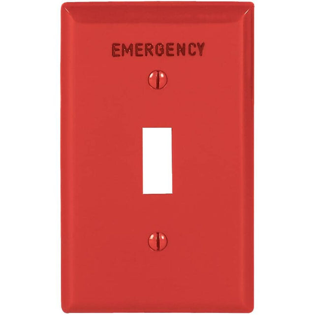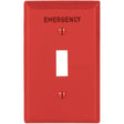 Toggle style wall plate in Emergency Red with “EMERGENCY” text printed on it.