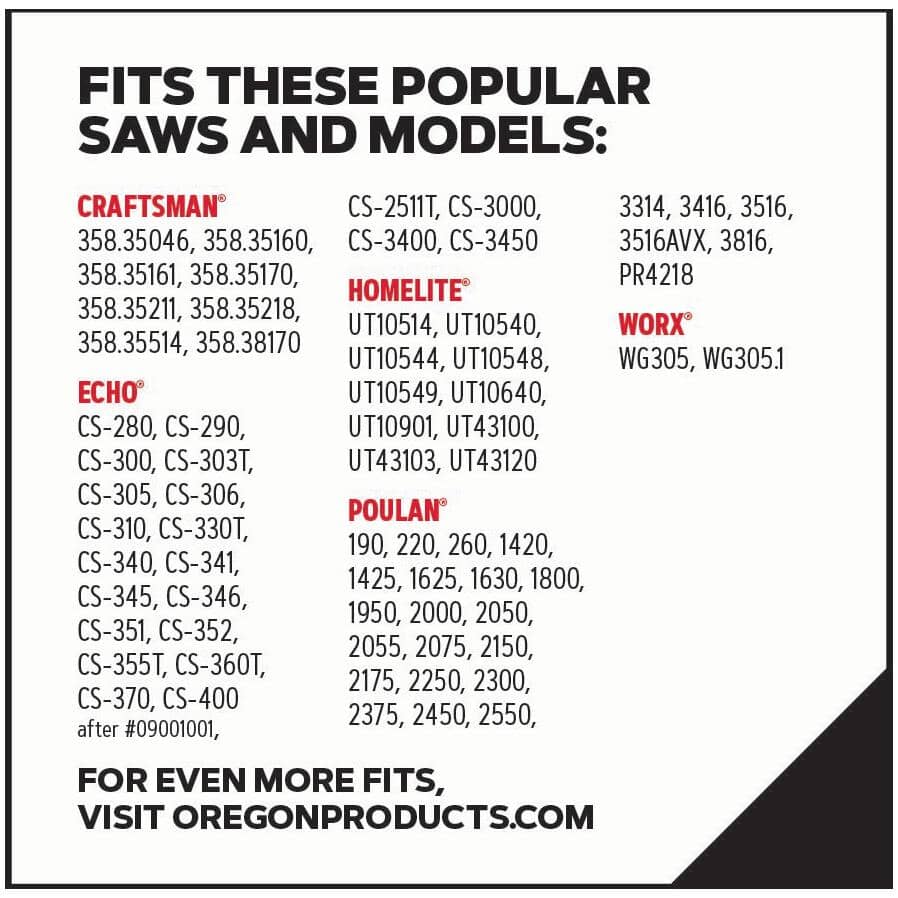 This Oregon 14" guide bar and chain combination features a S52 3/8" low profile chain that is ideal for homeowners and occasional users who want a low-vibration, low-kickback saw chain. The Chamfer Chisel cutters offer outstanding performance and are durable, easy to maintain and forgiving. Fits Echo, Craftsman, Poulan, Homelite, Makita, Husqvarna, Ryobi, and others equipped with a 14" bar with 3/8" low profile, .050" gauge saw chain with 52 drive links.