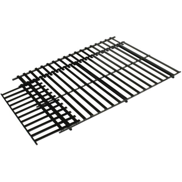 Compact, steak house style, porcelain coated steel cooking grids are designed to adjust in both depth and width creating the ability to fit most smaller sized gas grills. The porcelain coating provides both a smooth cooking surface while remaining rust resistant.
