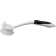 The dish and sink brush has a soft grip plastic handle with hang up hole. A smaller detail brush is molded into the head for those tough to reach areas. Excellent at removing dirt, grime and residue.