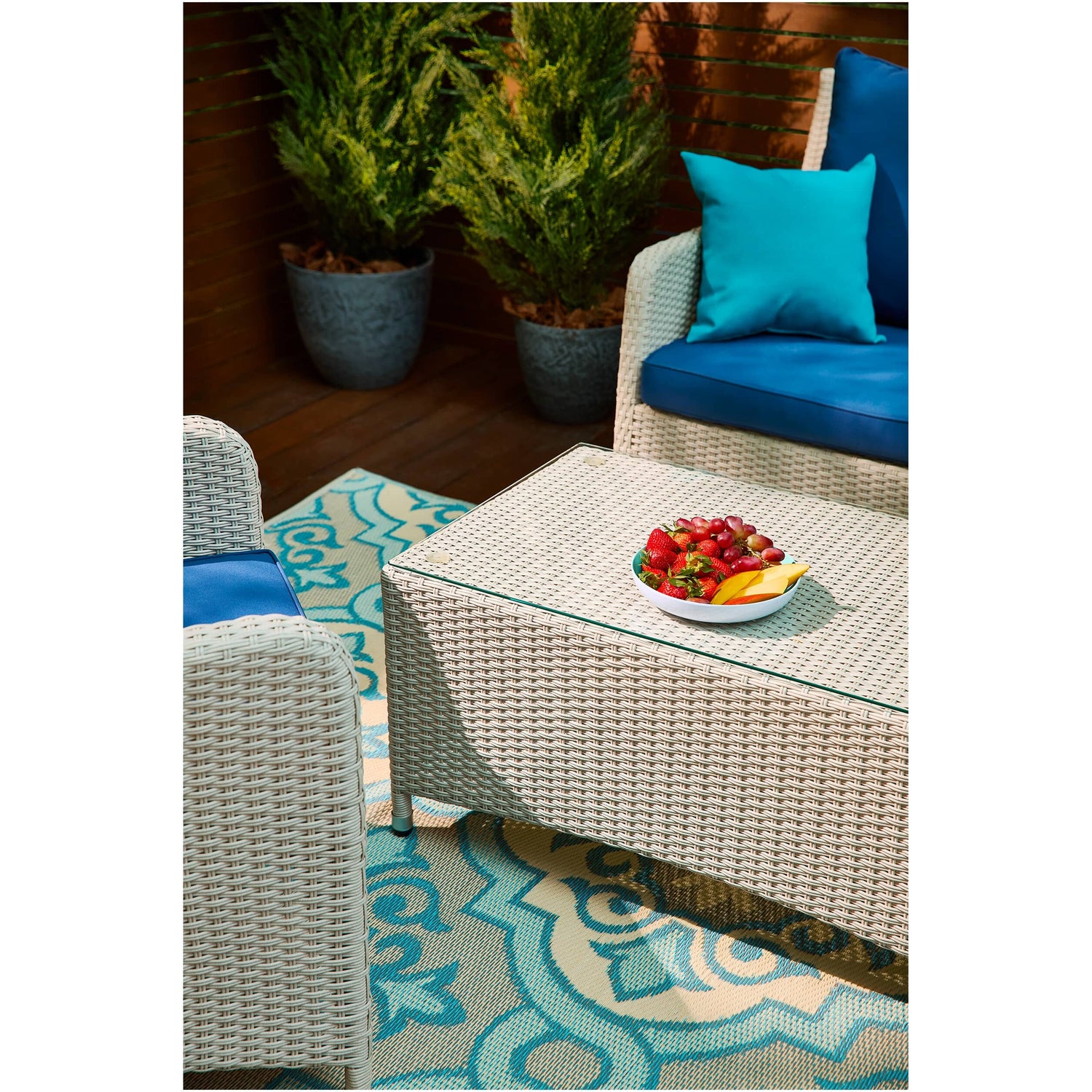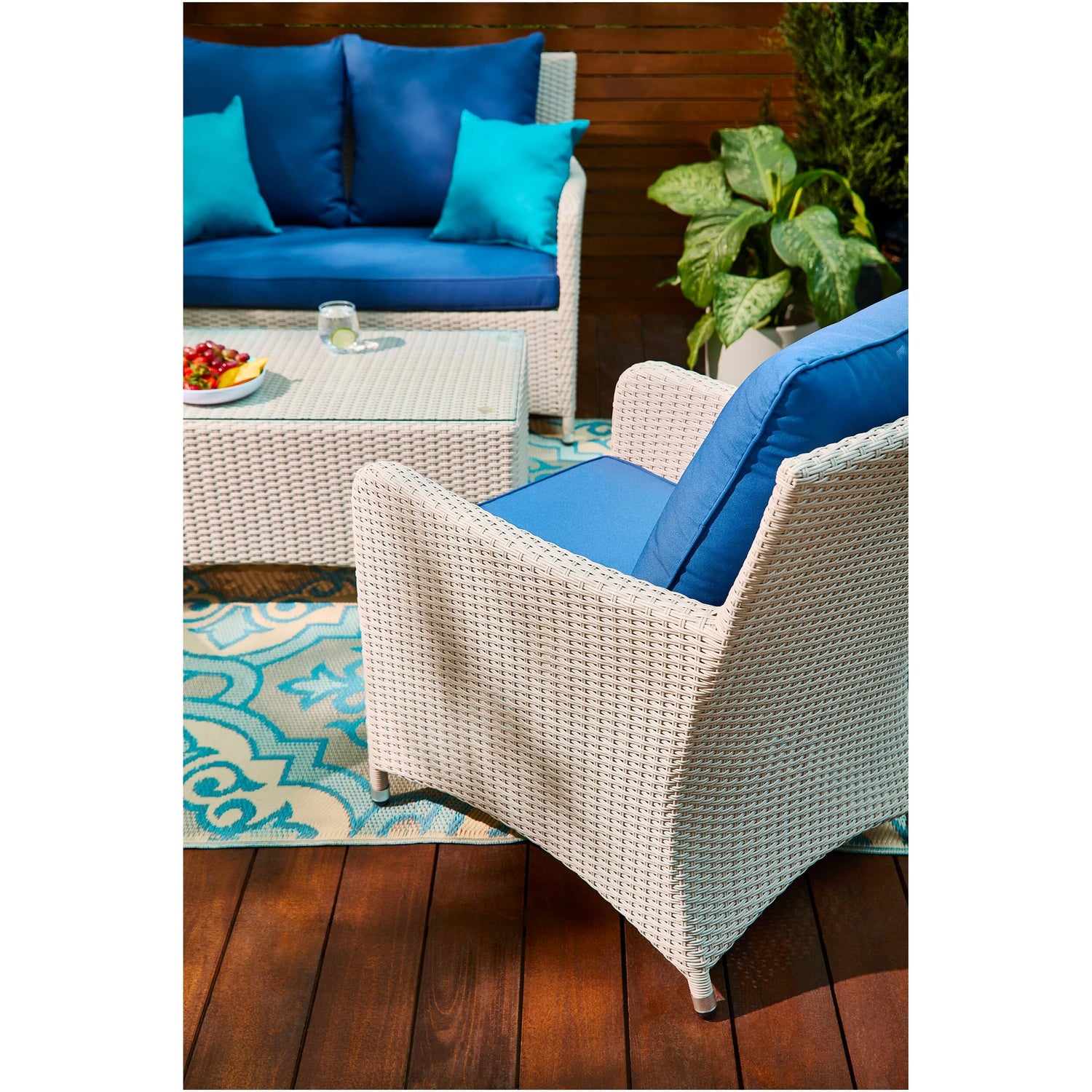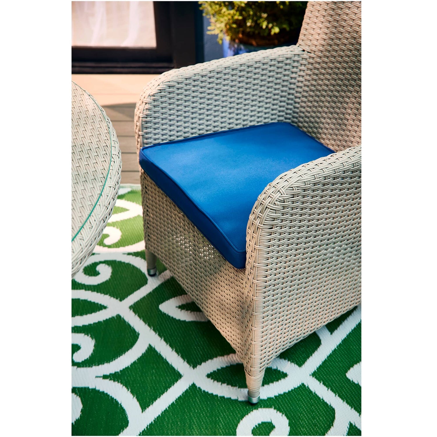 Add a cozy seating area to smaller outdoor spaces with the three-piece Solana chat Set. Light, relaxing colours pop against green foliage and pair well with natural elements and wooden accents. Complete the look and pair with the Solana Dining or Lounge Set for cohesion between outdoor areas.