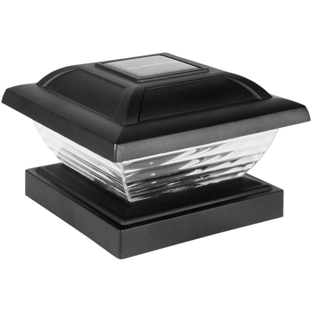 This Solar Post Cap Light features bold contemporary styling with clean lines and a black finish, and is highlighted by a clear lens with horizontal ribbed design. Featuring 1 warm white LED providing 10 lumens of light output, this post cap light will be sure to accentuate the fence or deck posts in your yard. Fits 4, 4.5 and 5 inch posts, is very easy to install and includes all mounting hardware.