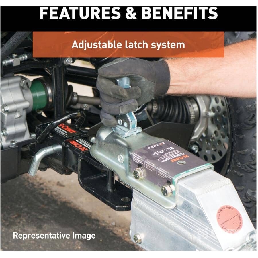 If you are replacing a broken coupler on your trailer or installing a new one on a trailer you are building, CURT has dependable couplers you can trust to keep your tow load latched on tightly. Selecting the right trailer hitch, ball mount and trailer ball to manage the weight of your trailer is not the only important aspect of towing; you also need a trailer that can stand up to the road ahead. That means equipping it with a coupler that is built to go the distance. CURT straight-tongue couplers, featuring our Posi-Lock latch, are the most common type of trailer coupler. With a mounting channel designed to fit onto a straight trailer tongue, the Posi-Lock coupler is easy to install. It is made from hardy steel construction and has a durable zinc finish to protect it from corrosion, wear, and tear. The lockable latch mechanism on CURT Posi-Lock couplers is easy to operate and adjusts by tightening or loosening a simple bolt. This CURT straight-tongue coupler features a gross trailer weight capacity of 3,500 lbs. and a tongue weight capacity of 500 lbs. It has a 2" channel and fits a 2-1/2" diameter trailer ball.