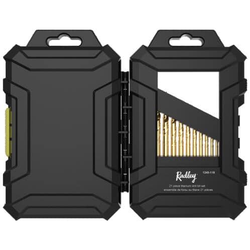This RADLEY Titanium coated drill bit set provides a full assortment of sizes from 1/16” to 3/8”. Titanium-nitrate coating creates less friction and runs cooler, while extending blade life. 135 degree split point allows for a precision start without bit walking. Best when drilling metal, wood, and plastic.