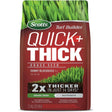 Here’s how to grow a lush lawn in a hurry: Scotts Turf Builder Quick + Thick Grass Seed Bluegrass Sun Mix 12-0-0. Grows grass 2X thicker – in just 14 days Our exclusive mix contains our highest quality grass seed plus a special blend of slow-release fertilizers. So, seed not only gets a quick start, it grows into thick, green grass that lasts. 99.99% weed-free grass seed made just for sunny areas. Ideal for overseeding existing lawns. Great for establishing a new lawn on bare soil.