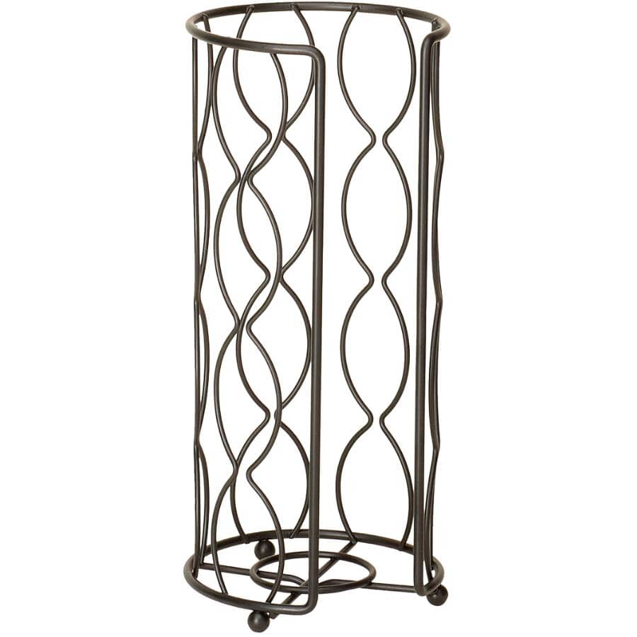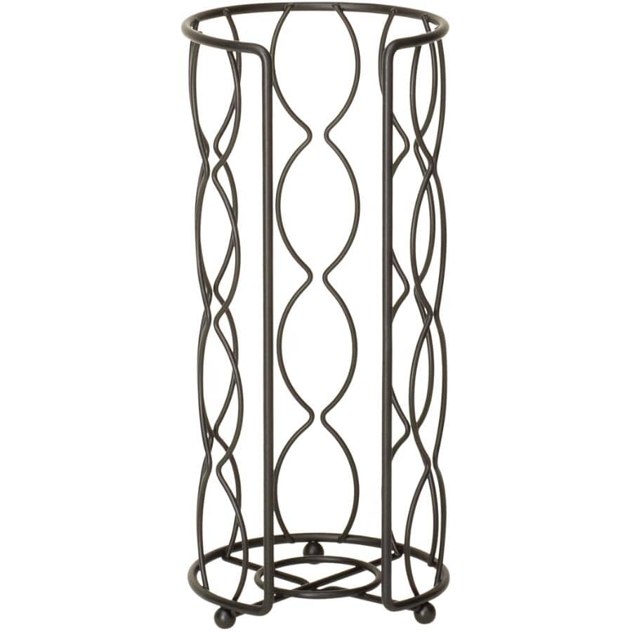 Add extra storage and functionality to any bathroom while keeping toilet paper close at hand with this free-standing toilet paper holder. It features a convenient arm for dispensing toilet paper and stores an additional three rolls below. The design detailing adds a decorative look, and the modern black finish is rust resistant and easy to mix and match with other fixtures in your bathroom, allowing it to work well with a range of decor themes. This toilet paper stand is made with black coated steel, so it's durable and designed for long term use. This space saving toilet paper storage is an ideal choice for small bathrooms, guest baths, and powder rooms with pedestal sinks.