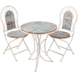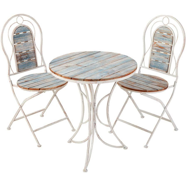 Take a load off and have lunch in the open air on this beautiful bistro set with a round shaped table and two chairs. The washed wooden seats and tabletop along with the beautifully curved steel legs will add style and class to any outdoor atmosphere. Sturdily constructed from 100% steel and foldable for easy transport, this set is a perfect fit for any patio or garden.